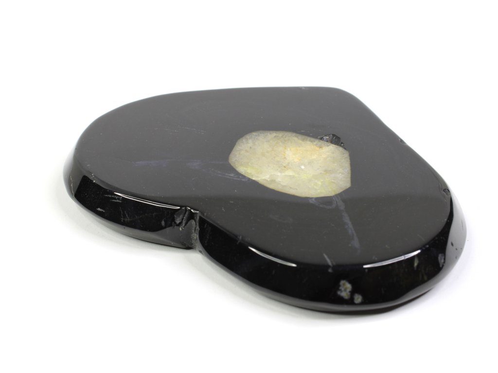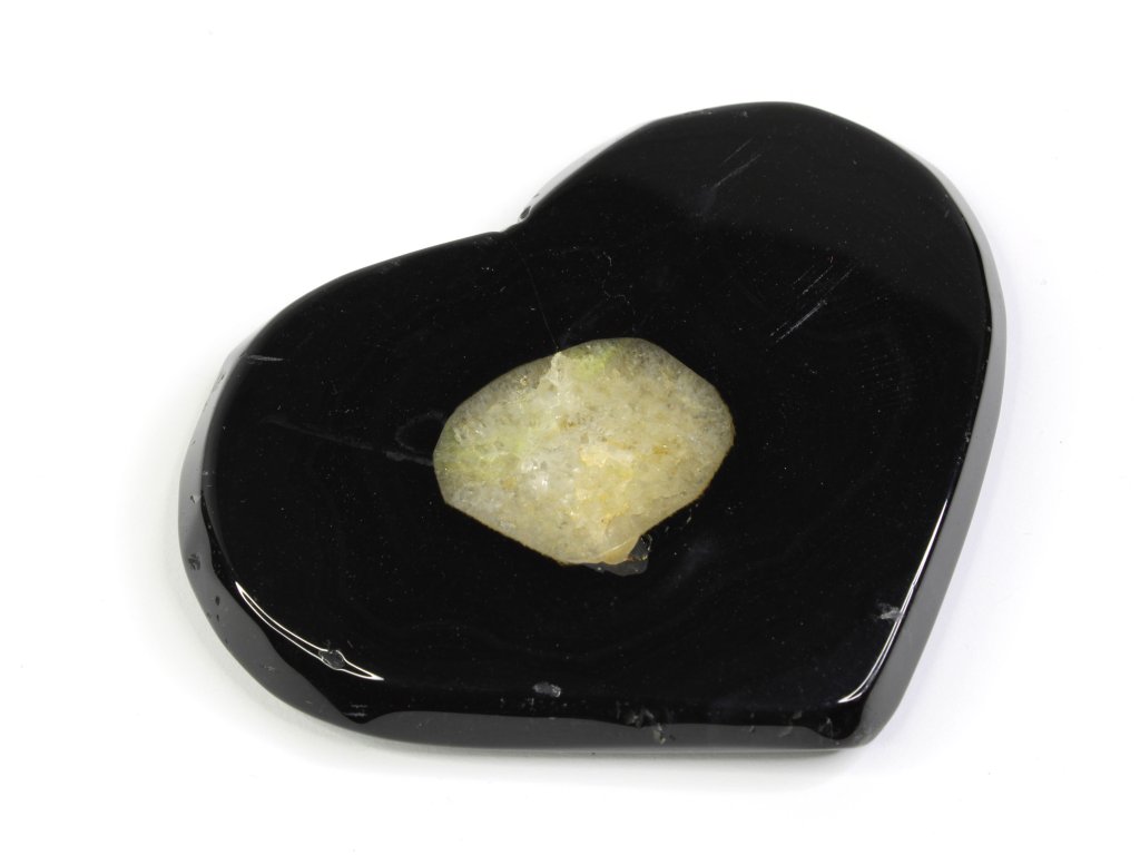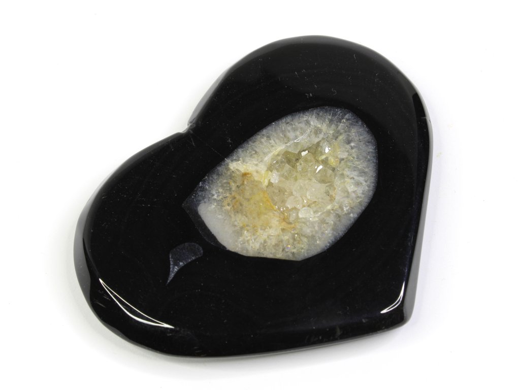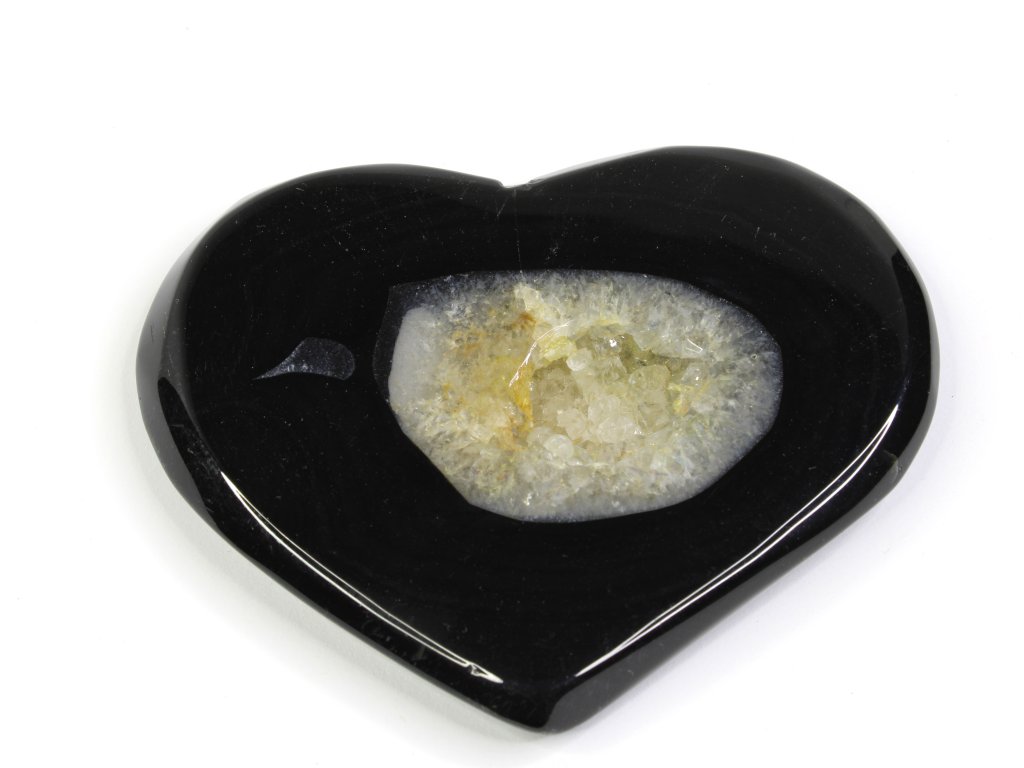 Černý achát – srdce s drúzou je elegantní a výrazný kus minerálu, který kombinuje hladký leštěný povrch s přírodní dutinou vyplněnou jemnými krystalky křemene. Tento kontrast dodává kameni hloubku a originalitu.