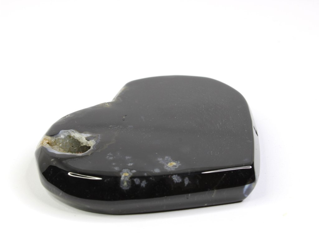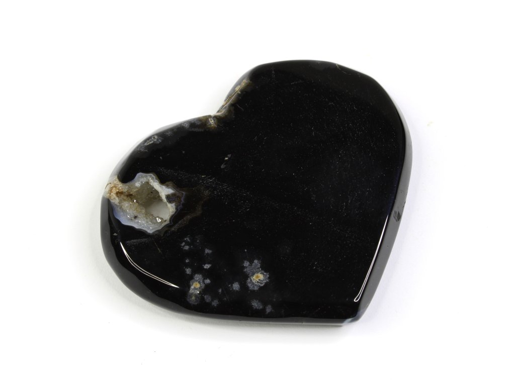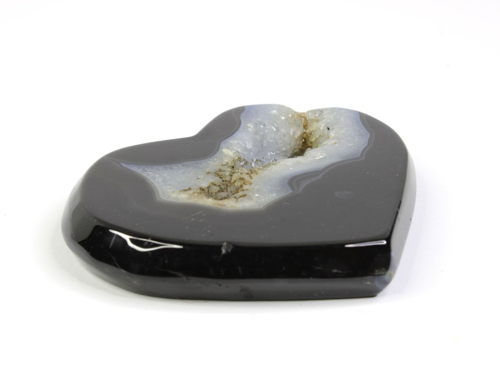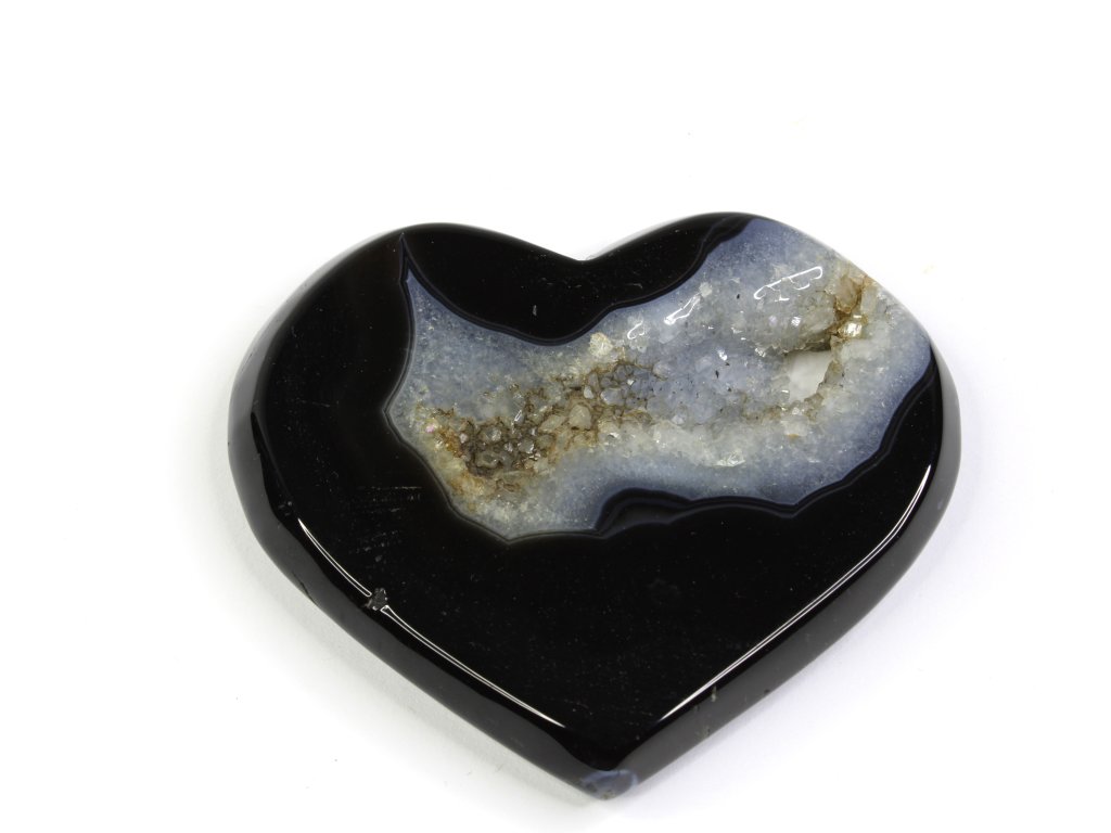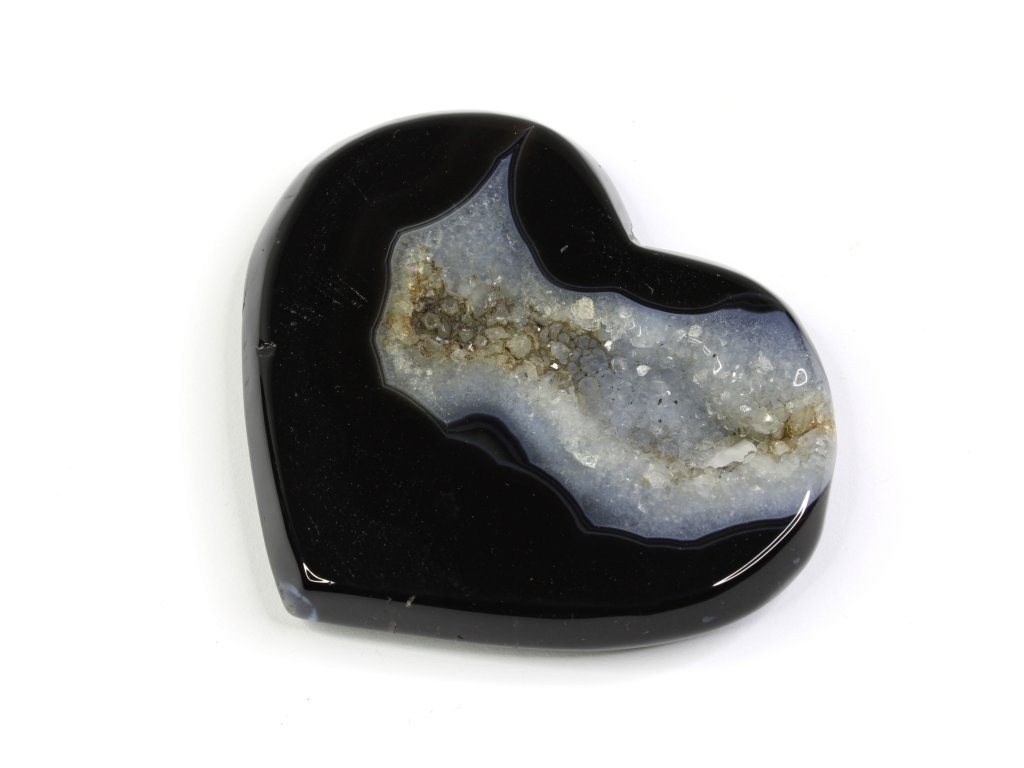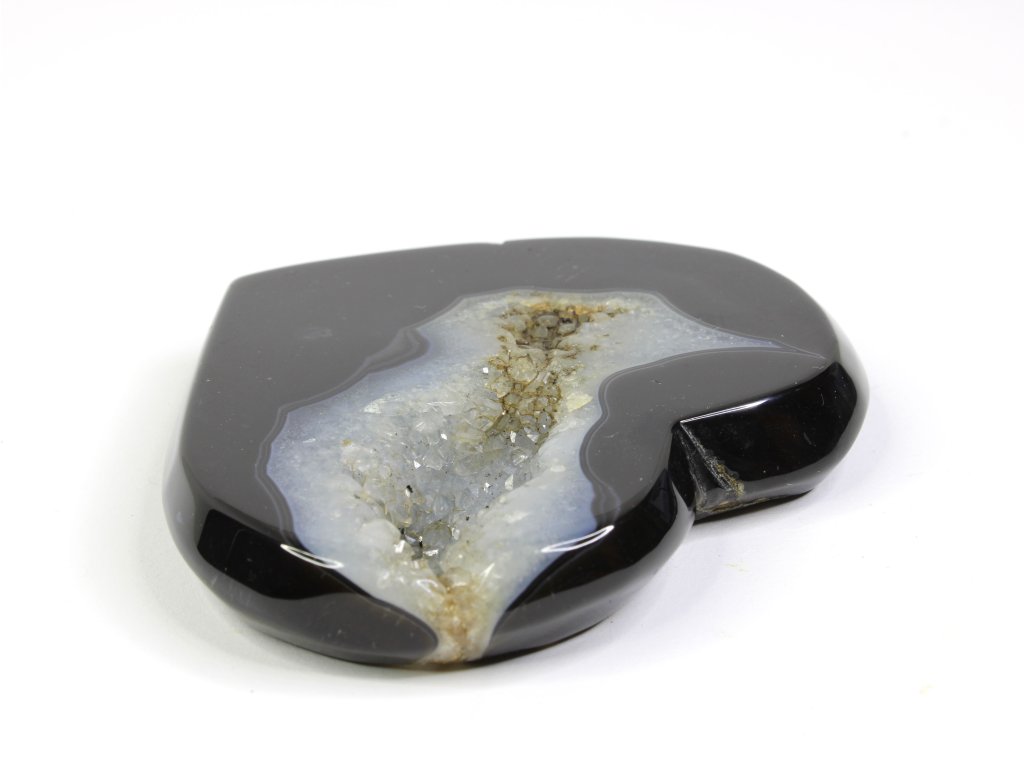 Černý achát – srdce s drúzou je elegantní a výrazný kus minerálu, který kombinuje hladký leštěný povrch s přírodní dutinou vyplněnou jemnými krystalky křemene. Tento kontrast dodává kameni hloubku a originalitu.